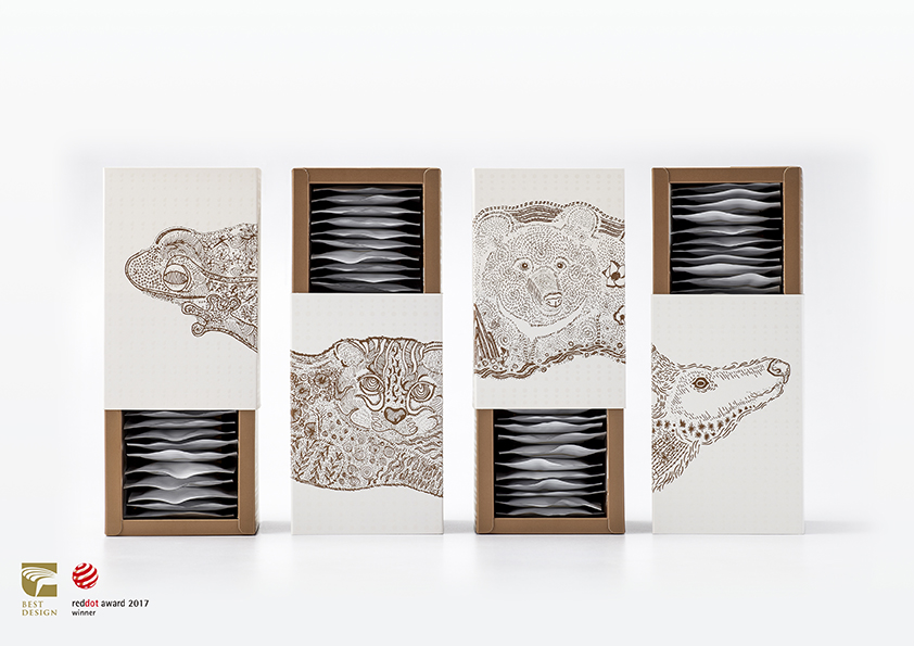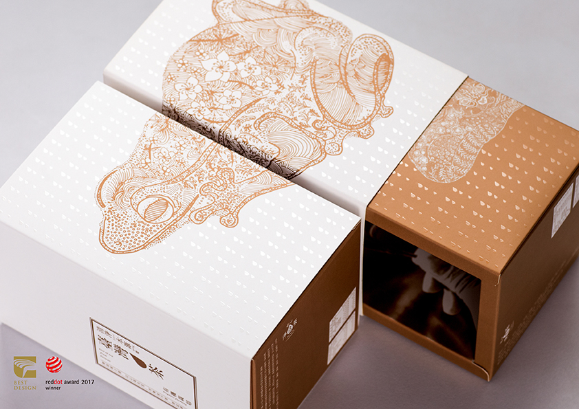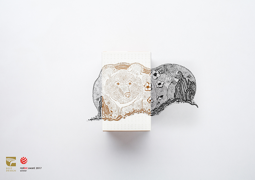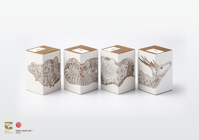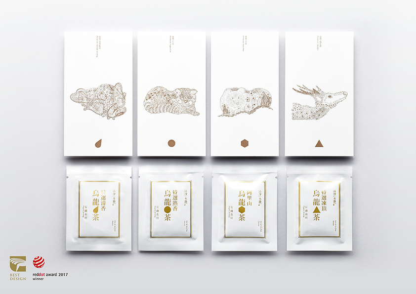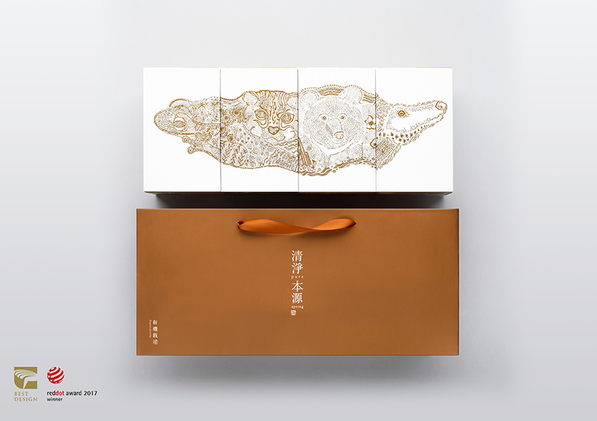 手繪形式詮釋商品的主題,單色簡樸高雅色彩配置,傳遞品牌從事有機耕作的初衷與使命。依序並置「樹蛙隨漣漪躍動,石虎於林間現蹤,黑熊循溪谷漫步,梅花鹿細雨探尋」能呈現完整臺灣地圖,分開時則代表其物種特徵、生存環境等特色。內盒二側是茶區之產業人文及地貌景緻,呼應品牌愛護土地與友善耕作。簡約結構設計成型前能攤開平放,便利運送及倉儲作業。內包裝以能即時品嚐的概念,作為國外遊客造訪臺灣,以及餽贈伴手禮的新選擇。