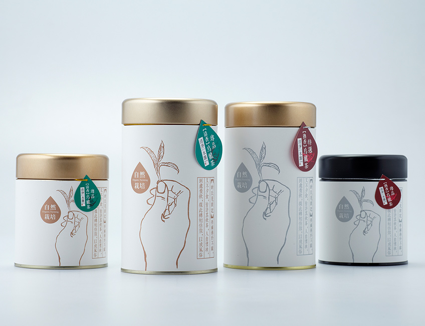 版畫形式傳遞手捻茶葉的情感與溫度,「留白」設計,是體現「有機農法」呼應禪宗裏的「空靈與簡樸」、「崇尚自然」。藉此訴說著茶農們嚮往自然之美,以及渴望追求人與自然環境和諧之心。在各茶區得天獨厚的環境,皆為藉由大地的恩賜所孕育灌溉,因此,將茶種系列以「四象聖獸圖形」搭配「色彩配置計畫」,做產品區隔與其延續性。